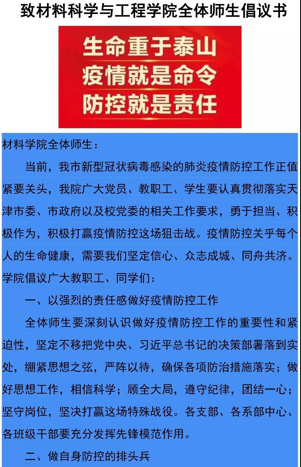 疫情就是命令,防控就是责任。为有效防控疫情蔓延,保障学院师生身体健康和生命安全,材料学院及时动员部署疫情防控工作,多措并举,筑牢防控工作安全网,全力以赴抗击疫情。